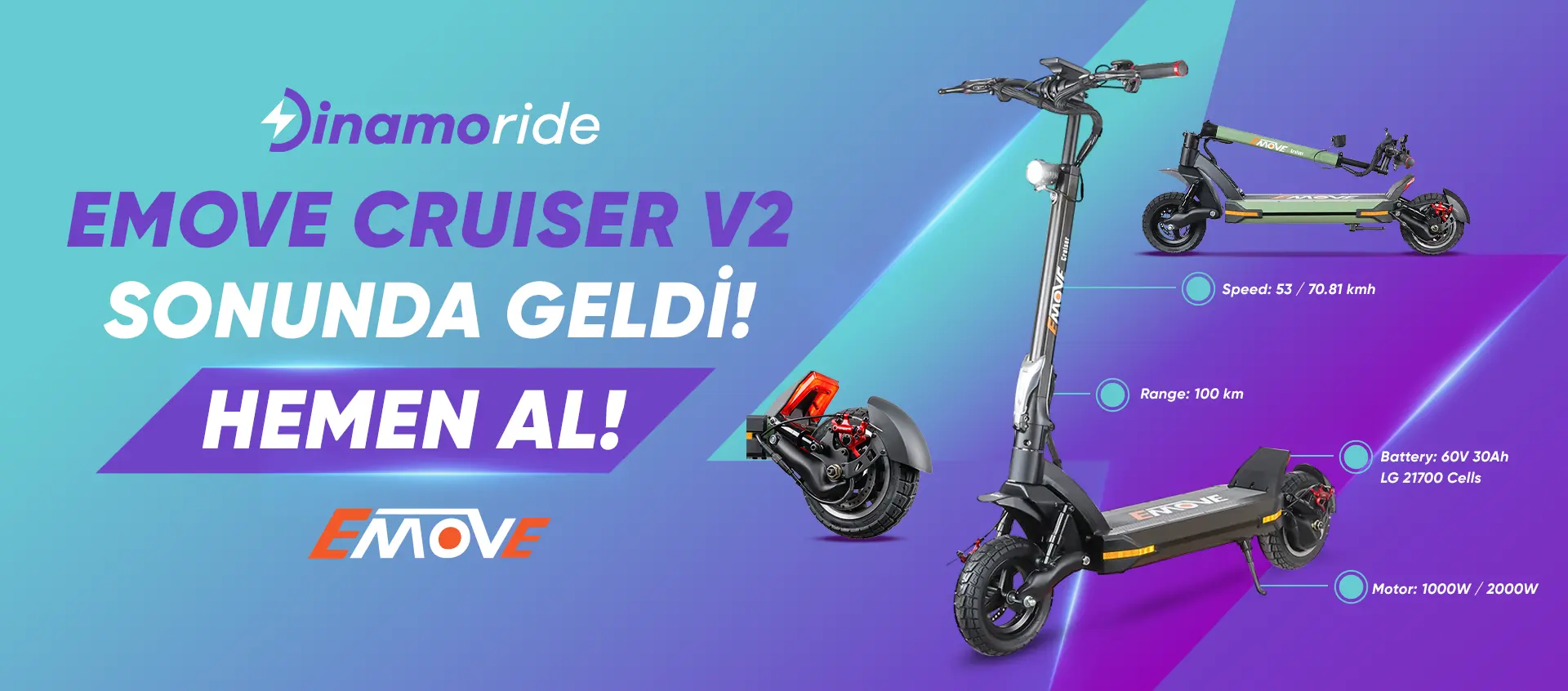 Elektrikli scooter'ınıza atlayın, Emove ile özgürlüğü yolda keşfedin. Çünkü şehrin keyfi Dinamoride ile çıkar.